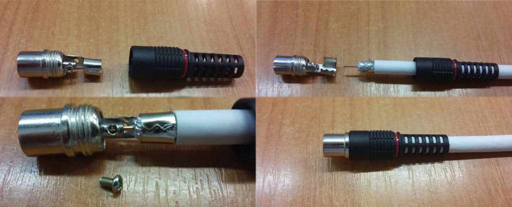 В данном случае центральная жила зажимается винтом, а оплетка обжимается корпусом штекера: