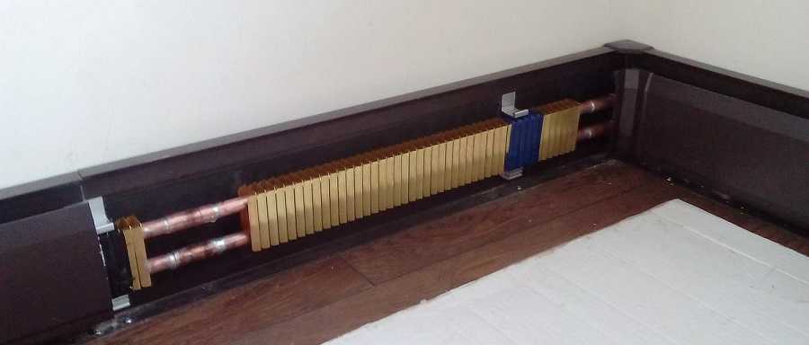 Трубы спрятанные в плинтусе не видны снаружи, но тем не менее, отлично прогревают помещение, за счет установки на них специальных рифленых пластин. Пластины здесь выступают в качестве теплообменника, повышая КПД системы.