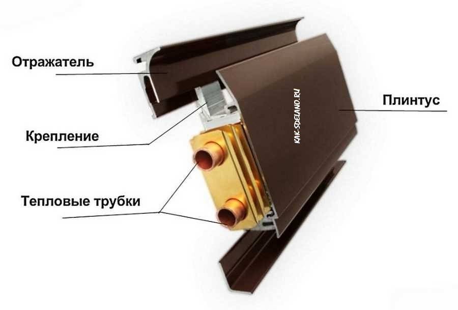 Нагревательный элемент в конструкциях такого типа скрывается под наружной оболочкой. В данном случае – оболочкой плинтуса. Оболочка выполнена из алюминия, что положительно сказывается не ее теплоотдаче.