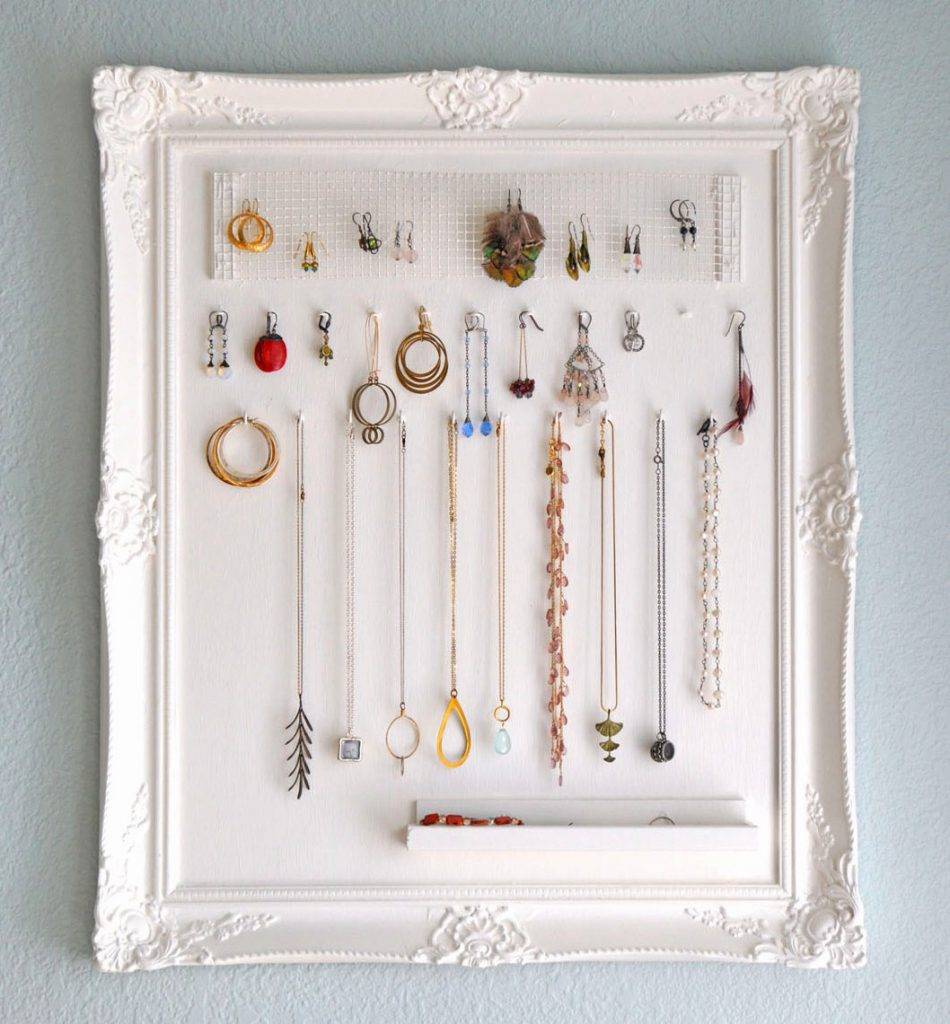Оригинальным современным приспособлением является картинная рама. В ней крепятся крючки для украшений, гвоздики либо струны. Рама не занимает много места в доме. Как и обычную картину, её вешают на стену. Можно использовать уменьшенный вариант – настольную рамку для фотографий. Этот вариант больше подходит для висячих украшений.