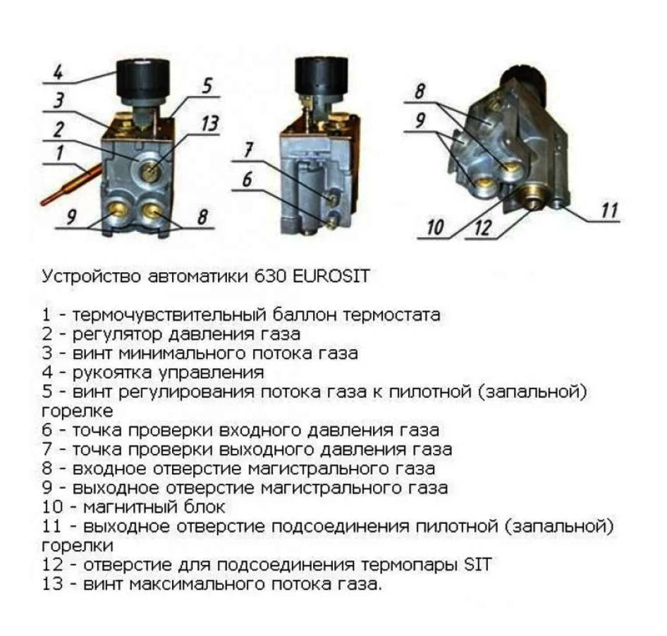 Температурный регулятор нагнетает подачу газа к горелке, когда вода остывает в контуре системы отопления, и перекрывает поток при достаточном нагреве. Монтируется термодатчик в газопровод. Оснащен он такими узлами: