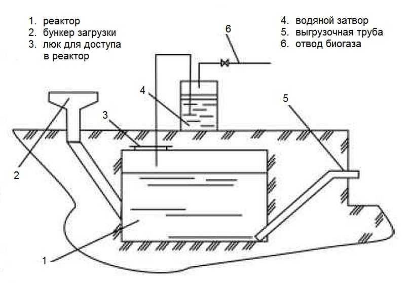 Схема получения биогаза Объем емкости биореактора рассчитывается исходя из количества сырья, которое используется, чтобы получить метан. Для того чтобы условия работы были оптимальны, емкость реактора заполняют отходами не менее чем на две трети. Для этих целей используют яму большой глубины. Чтобы герметичность была высокой, стенки ямы армируют бетоном или укрепляют пластиком, иногда устанавливают в яму бетонные кольца. Поверхность стен обрабатывают влагоизолирующими растворами. Герметичность – необходимое условие для эффективной работы установки. Чем лучше изолирована емкость, тем выше качество и количество образующегося газа. К тому же, продукты распада отходов ядовиты и, в случае утечки, могут навредить здоровью.