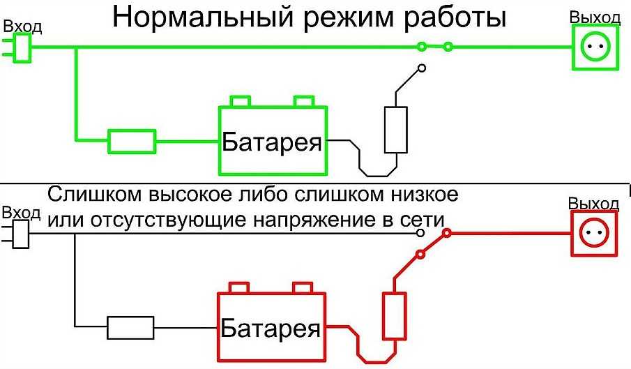 Он-лайн бесперебойники подключаются в разрыв цепи питания. Пока напряжение нормальное, преобразуется линейное питание, при пониженном напряжении его недостаток восполняется за счет заряда батарей, при отсутствии электропитание подается от АКБ.