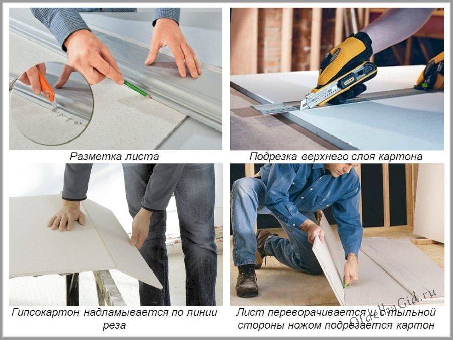 Иногда нужно разрезать гипсокартон в виде буквы Г (например, для дверного проема). Тогда нужно использовать несколько видов инструментов для гипсокартона. Короткая часть пропиливается при помощи ножовки, а длинная прорезается монтажным ножом. Плита надламывается и дорезается с обратной стороны. Эту работу можно проделывать и на уже установленном листе.