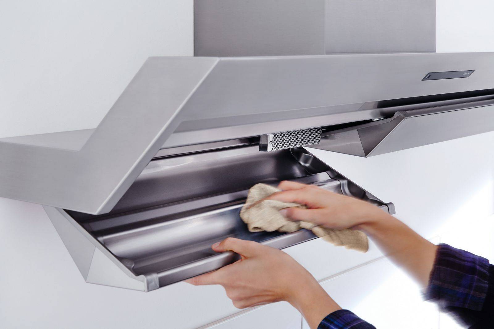 Чтобы на алюминиевой или стеклянной поверхности вытяжки не оставались разводы, воспользуйтесь средством для мытья окон и сухой тряпкой.