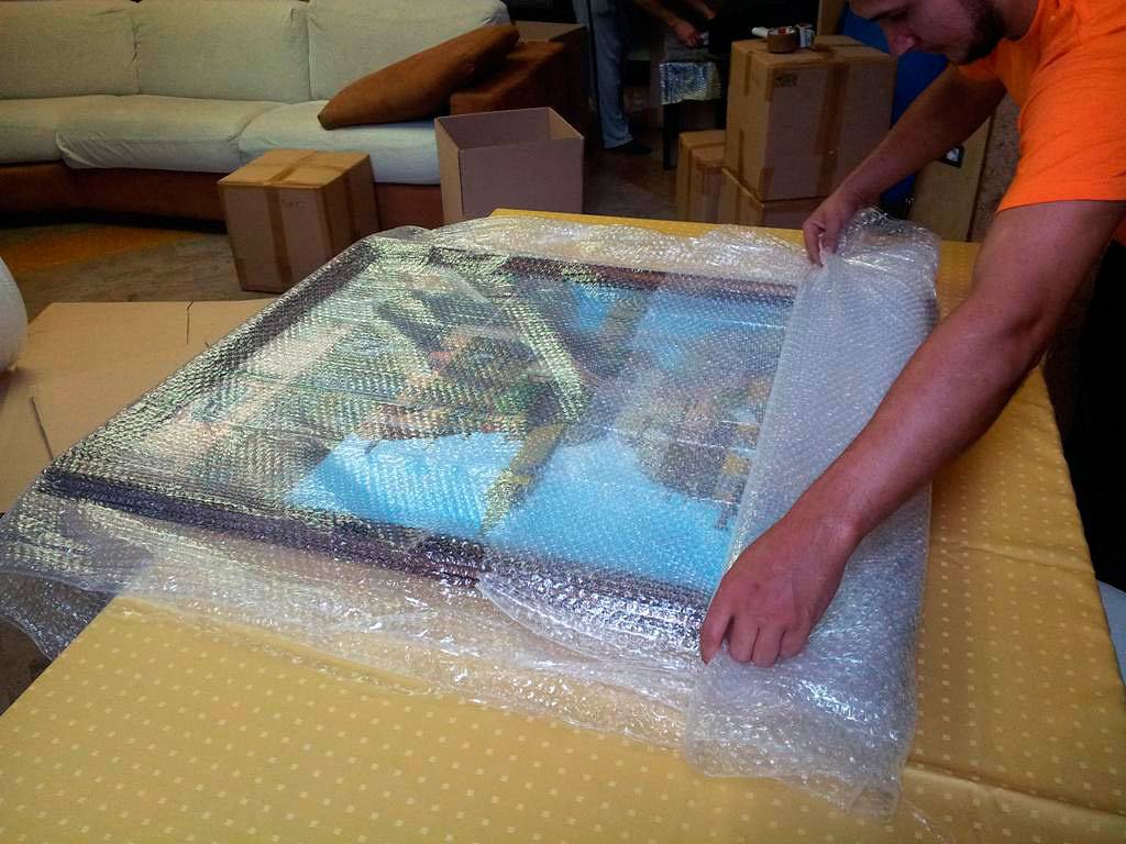 Самый простой и стандартный вариант использования пленки с пузырьками. Надо всего лишь обернуть вещь, зафиксировать пленку скотчем и можно отправлять мебель хоть на новую квартиру, хоть на склад. Это да. Но мало кто знает, что повернуть пузыри можно как внутрь, так и наружу и тут все зависит от ценности вещи и длительности транспортировки. Например, если надо сохранить картину в стеклянной раме, то пузыри поворачивают внутрь – они амортизируют, и стекло не разобьется.