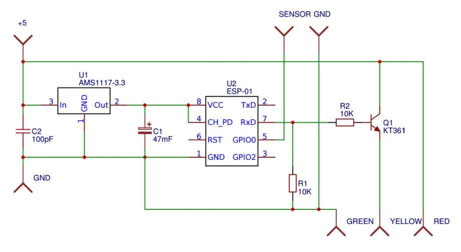 Управлять нашими электрическими кранами будет микроконтроллер ESP8266. Порт RxD будет управлять открытием/закрытием крана. Порт GPIO0 будет измерять сопротивление между ним и землей — датчик воды. Краны подключены не напрямую, а через транзистор КТ316. Ток для этих кранов не большой и этого маломощного транзистора хватает. Принципиальная схема устройства: