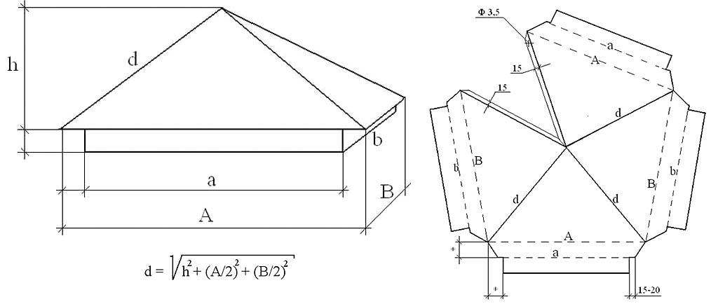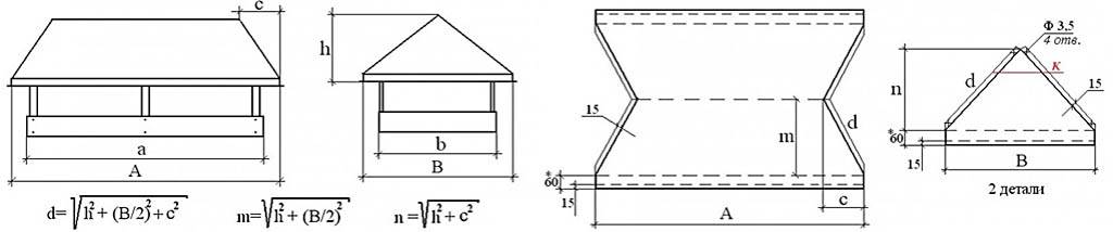 Процесс разработки и сборки дефлектора на вытяжную трубу состоит из четырех этапов: чертеж, создание заготовок, сборка, установка конструкции и ее закрепление непосредственно на дымоходе.