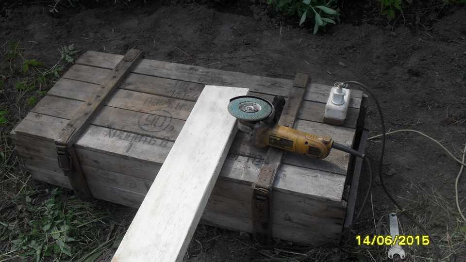 Выровняли пол и во второй половине, оставили схватываться. Приступили к обработке древесины. Купена осиновая доска. Ее сначала обработали шкуркой, закрепленной на болгарке. После пропитали защитным составом.