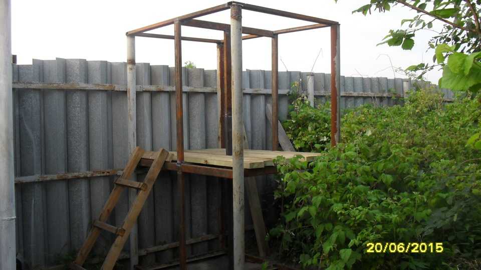 Когда территория на даче подготовлена, можно сооружать каркас. Использовать брус сечением меньше 100х100 мм не рекомендуется. Конструкция должна быть надежной, чтобы удерживать тяжелый бак с водой на крыше. Все материалы тщательно пропитывают средствами от вредителей и воздействия влаги. Начинают строительство с установки столбов. В углах выкапывают ямы глубиной от 50 до 100 см. Столбы опускают в углубление и засыпают щебнем, затем заливают бетоном. Для дверей нужны 2 дополнительные стойки, которые размещают по ширине дверной коробки, оставляя зазор в 2-4 см.