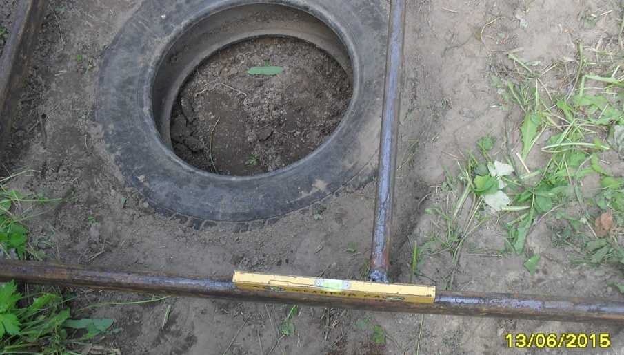 Почвы песчаные, вода уходит очень быстро, потому для слива закопали только одну шину. Испытания ливнем показали, что больше и не требуется. Воды налило намного больше чем у меня в бочке, а никаких луж не наблюдалось.