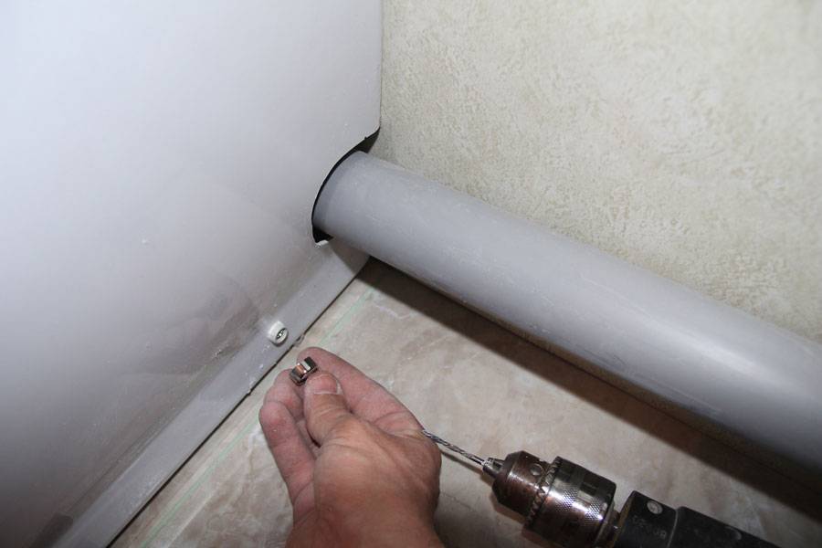 Устанавливаем экран на место, подперев клиньями. Если трубы не дают установить экран, делаем вырез лобзиком с мелкой пилкой.