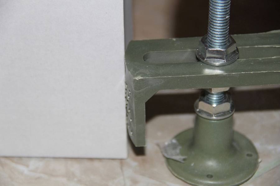 Регулируем кронштейны с помощью угольника от разметки на полу, минус 2 мм. Нижний край кронштейна должен выставляем с зазором от пола 2 см.