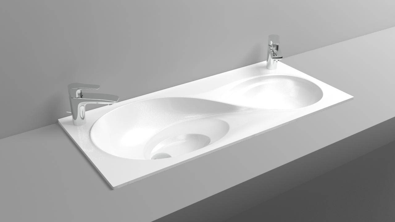 Накладные. В этом варианте сдвоенный умывальник выглядит монолитным полотном, соединенным с тумбой. Он заменяет собой весь ее горизонт в верхней части. Края чаш загнуты вниз, что идет во благо установке и повышает прочность конструкции. Наиболее простые раковины в монтаже.