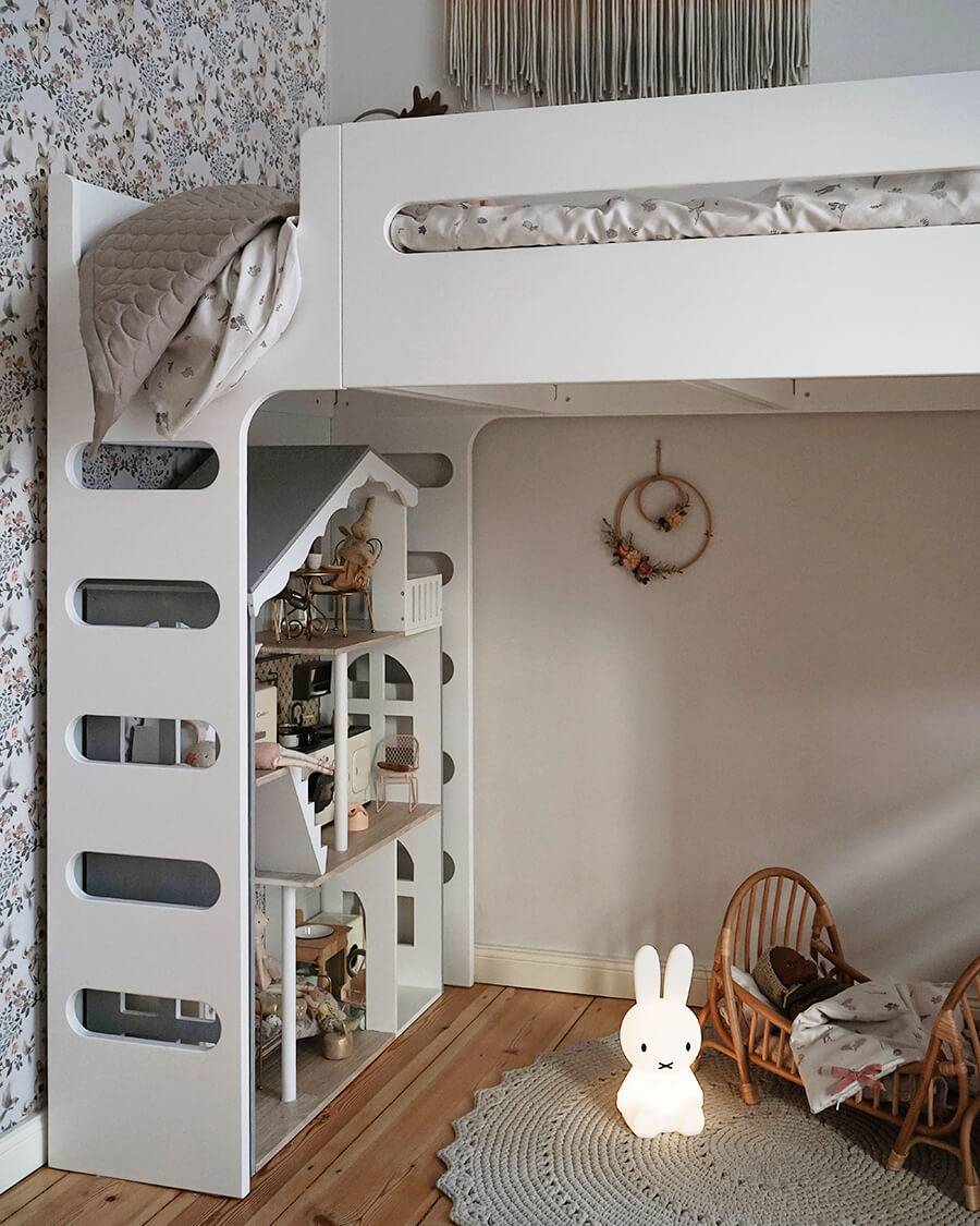 Девочкам делают детский уголок в светло-коричневых, розовых, белых тонах. Стенки, спинки разрисовывают узорами или вырезают на них орнамент. На нижнем этаже кровати можно сделать настоящий домик, например, повесив шторки и проделав в боковой спинке окошко. Сооружение украшают коваными деталями, мозаикой или наносят на поверхность орнаменты с помощью техники декупаж. Девочкам подойдут модели двухъярусной кровати с ящиками: в них удобно хранить наряды, белье, игрушки или книги, одновременно с тем они выступают лаконичным, стильным украшением конструкции.