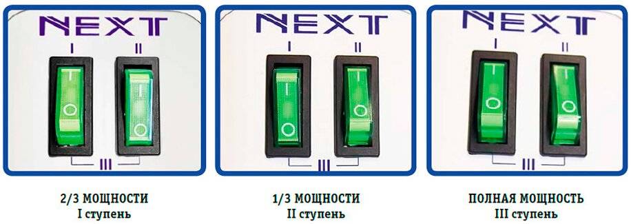 - Выключатель 1 – первая ступень мощности. Обеспечивает 2/3 от заявленных значений. Нажата первая клавиша, отключена вторая. Режим предусматривает обогрев строения в прохладные времена года – осенью, весной, дождливым летом.