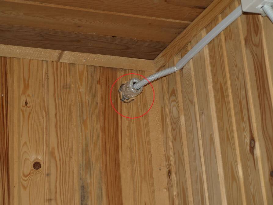 Первый – это все проходы электрокабелей сквозь выполненные из дерева внешние стены, перегородки и перекрытия делаются только с использованием металлических гильз (трубок). Даже если применяются кабель-каналы и керамические изоляторы для открытого монтажа, сквозь древесину электрическая проводка должна проходить исключительно с дополнительной защитой из металла.