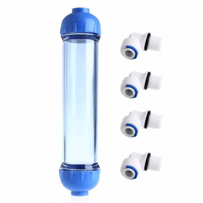 - Последовательно соединить колбы двумя переходниками-ниппелями в четверть дюйма. При этом необходимо строго придерживаться обозначений in/out, чтобы соблюсти направление движения воды. Резьбы ниппелей следует уплотнить ФУМ-лентой.