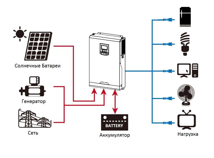 Гибридный тип подобных устройств, предполагает установку инвертора между аккумуляторами, внешней сетью и нагрузкой одновременно.Использование инвертора, в схемах солнечных электростанций, позволяет осуществлять их работу в автоматическом режиме, что значительно упрощает их использование и расширяет сферу применения.