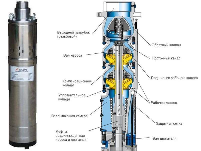 В вихревых погружных насосах забор и выталкивание воды происходит с помощью одного рабочего колеса с лопатками, которое расположено в верхней части вертикально подвешенного корпуса рядом с выходным патрубком. Для снижения гидравлических потерь в конструкции предусмотрено очень малое расстояние между боковой гранью диска вихревого колеса и рабочей камеры – это делает невозможной работу вихревых устройств в среде с частицами песка.