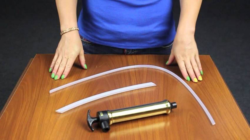 Это наиболее простая конструкция из всего огромного перечня. Самодельную помпу для перелива воды возможно сделать своими руками всего за несколько минут. В качестве исходных материалов подойдут: резиновая трубка или шланг, горловины от пластиковых бутылок с крышками. Такое приспособление крайне необходимо иметь на любом приусадебном участке, где требуется частый и интенсивный полив.
