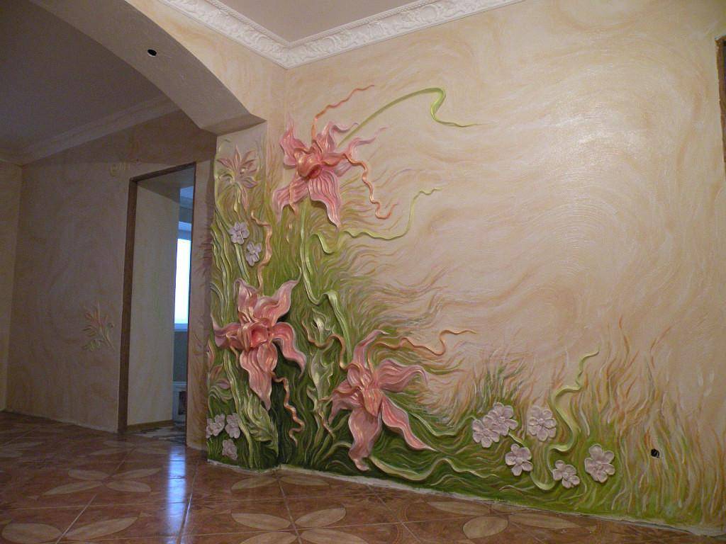 Краска фактурного типа представляет собой густую белую массу, в которую в процессе работы добавляются специальные красители. В качестве дополнительной декоративной отделки применяется техника нанесения рисунка на уже готовую поверхность. Умело используя возможности краски, можно добиться имитации различных материалов: ткани, дерева, камня, мраморной поверхности. А варианты цветов и оттенков можно изобретать до бесконечности.