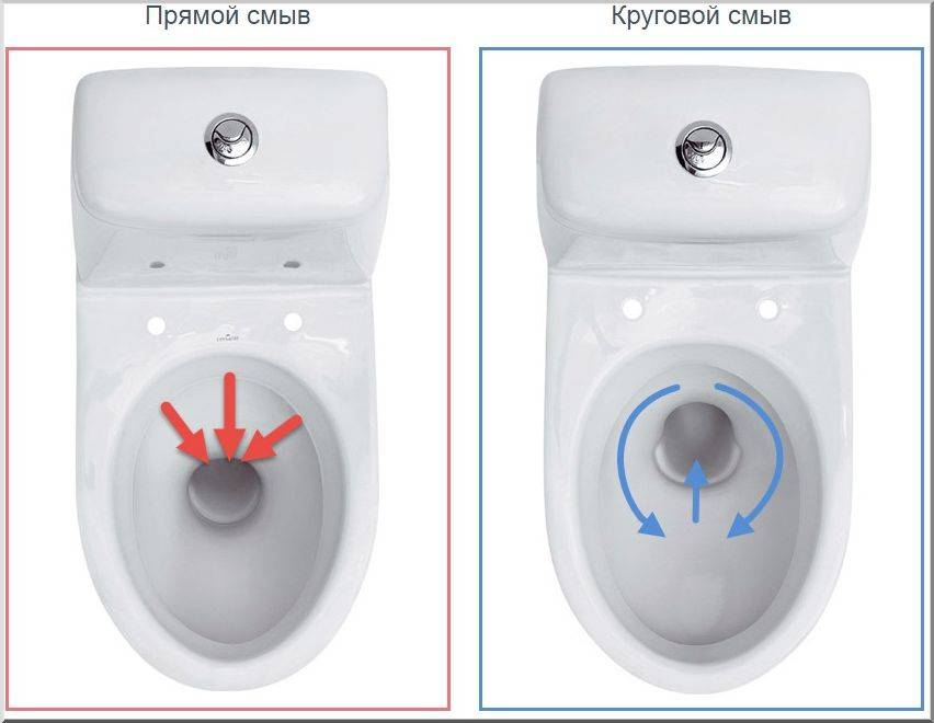В теории существует 2 способа слива – прямой и круговой. В первом случае вода стекает по прямой, от бачка в отверстие и омывает только заднюю часть чаши, а во втором, вода идет по кругу, соответственно вымывает всю чашу. В действительности унитазы с прямым сливом уже никто не делает, но при выборе этот пункт стоит проконтролировать.