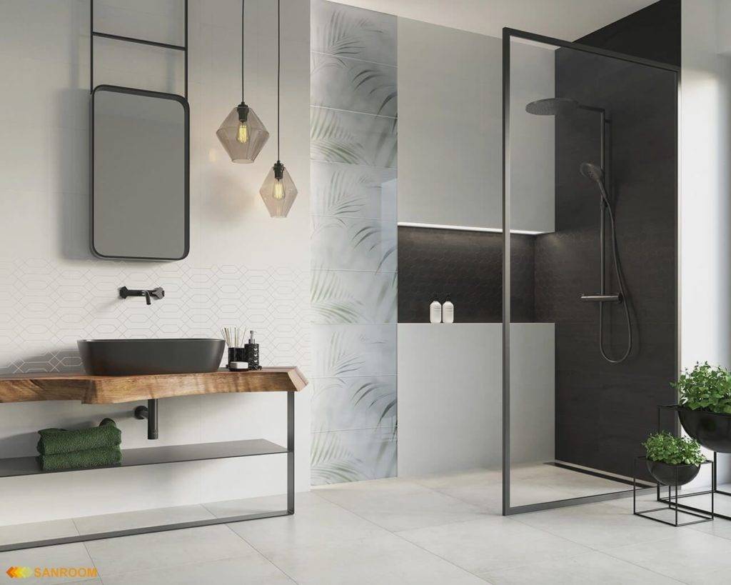 Когда облицовывается ванная комната с душем без кабины, используются материалы, способные выдерживать частые перепады высот и повышенную влажность. Лучше всего для этого подходит обычная керамическая плитка или мозаика. Для отделки низа нужно использовать ту, что имеет шероховатую поверхность. Тогда пол не будет скользким, и на его мокрой поверхности никто никогда не поскользнётся.