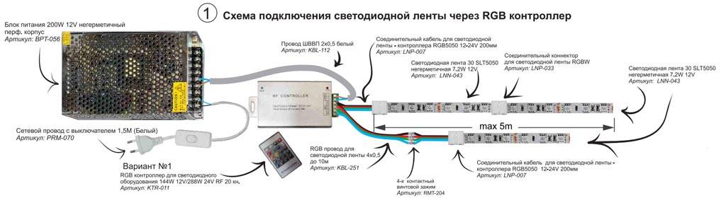 Когда разобрались с подключением контроллера к RGB-ленте, ваш следующий шаг – соединить все оставшиеся детали в общую цепь. Рассмотрим несколько схем подключения, когда требуется соединить один и более отрезок, а также в каком случае необходим усилитель.