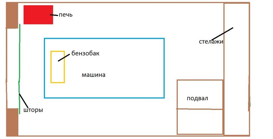 3) Склоняюсь к третьему варианту. В углу стоит шкаф, место для него очень удобное. От шкафа отступить 50 см и поставить печь. Печка будет находиться относительно машины напротив заднего колеса или задней двери смотря как встать.Дымоход будет прямой в крышу, а не как многие делают в стену, поэтому расположение печки свободное.Также к печка будет находиться ближе к центру гараже что даст более равномерный прогрев. И рабочая зона возле стеллажей, греть ворота смысла нет.