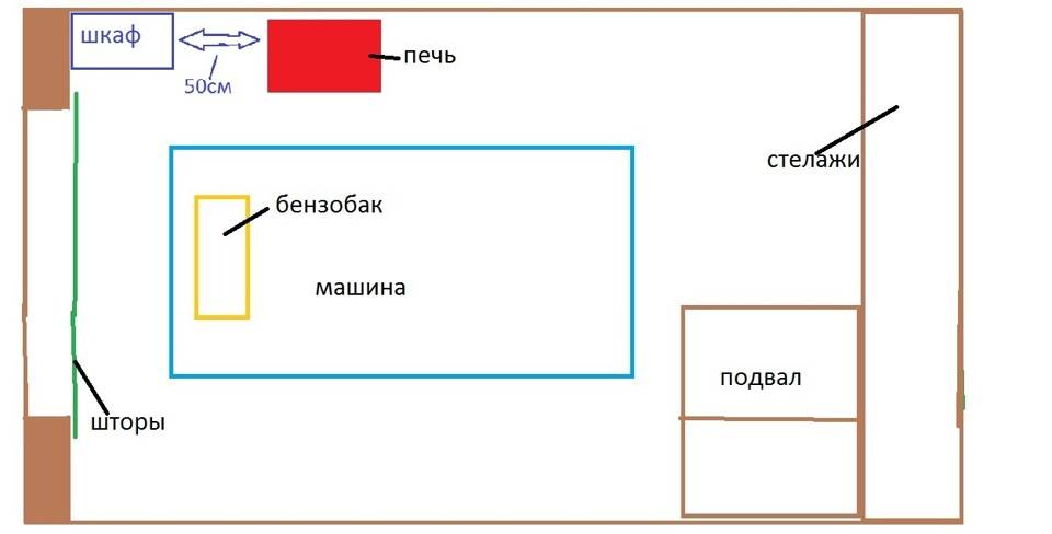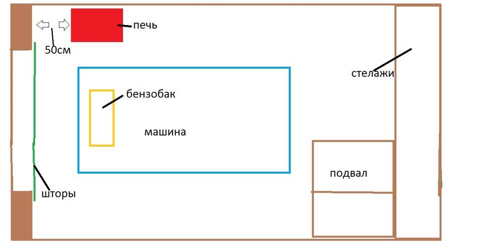 2) Второй вариант, по правила с отступом 50 см. Но печка при этом будет находиться около бензобака и это мне не нравиться, расстояние между печкой и машиной 90 см.Так же стена с воротами обмерзает инеем, при топке все это побежит