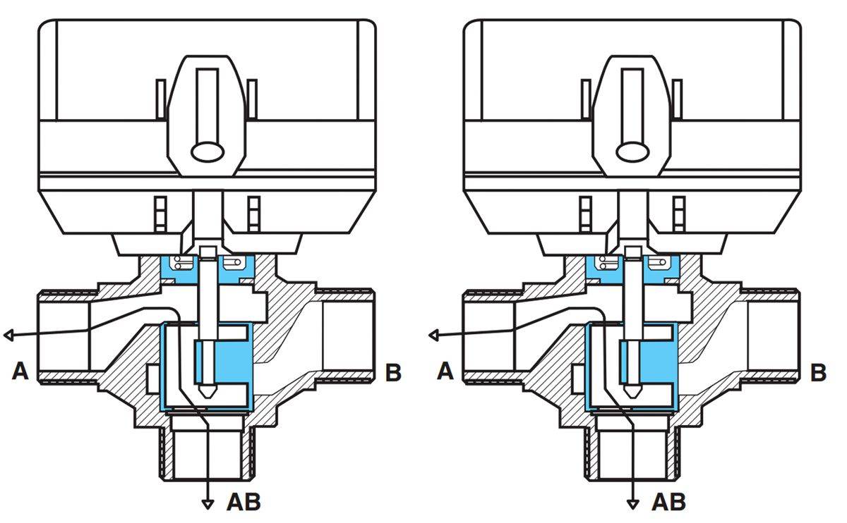 Обычно термосмесительные и разделительные клапаны полностью не перекрываются. А вот переключающие, как вы можете увидеть, закрывают один из патрубков, а другой открывают. При этом смешивания или разделения не происходит.