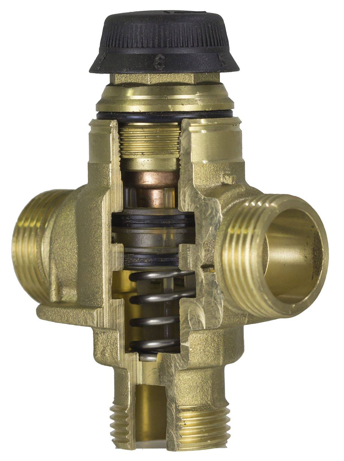 Упрощенными считаются трехходовые клапаны автономного типа. Их внутреннее устройство действительно упрощено, поскольку ни термоголовки с контроллером, ни штока в них не предусмотрено. Термостатический элемент установлен внутри и рассчитан на определенную температуру (зачастую 50°C или 60°C). Изменить настройки уже не получится, температура потока на выходе из клапана всегда будет соответствовать заданной ±2°С. Этот вариант для тех, кто устанавливает клапан в несложные системы отопления и хочет сэкономить. Стоимость упрощенных элементов примерно на 30% ниже средней стоимости основной массы регуляторов.
