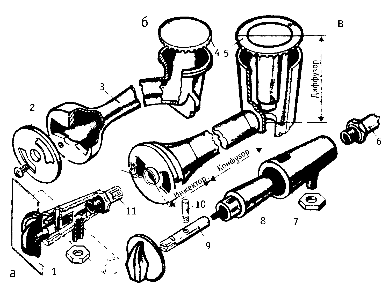 Рис. 1-10-7. Части газового тракта газовых плит прошлых лет выпуска: а — пробковый кран, б, в — горизонтальные горелки;