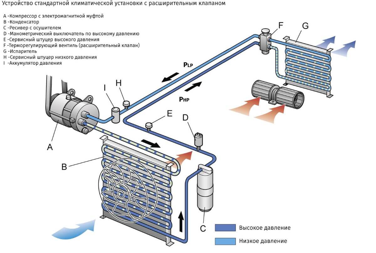 Из каких элементов состоит автомобильный кондиционер в машине, какие расходные материалы нужно использовать для обслуживания системы кондиционирования, какова принципиальная схема агрегата? Для начала давайте разберем, как устроен кондер.