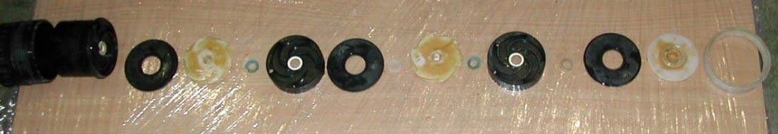 Снимается фильтр корпуса и последовательно разбирается насосный механизм – стаканы, крыльчатка и шайбы выкладываются на столе.