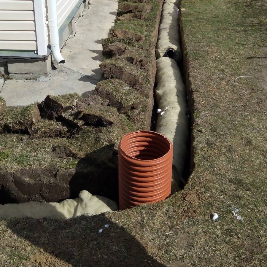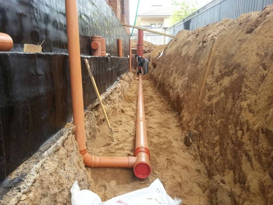В процессе проведения работ роется канавка глубиной до 350 мм. Если коммуникации ставятся в песчаный грунт, то ширина траншеи будет такой же. Для глинистых почв и суглинков требуется более широкая основа – до 450 мм. Необходимо обустроить один центральный водовод, куда и направить все боковые трубы.