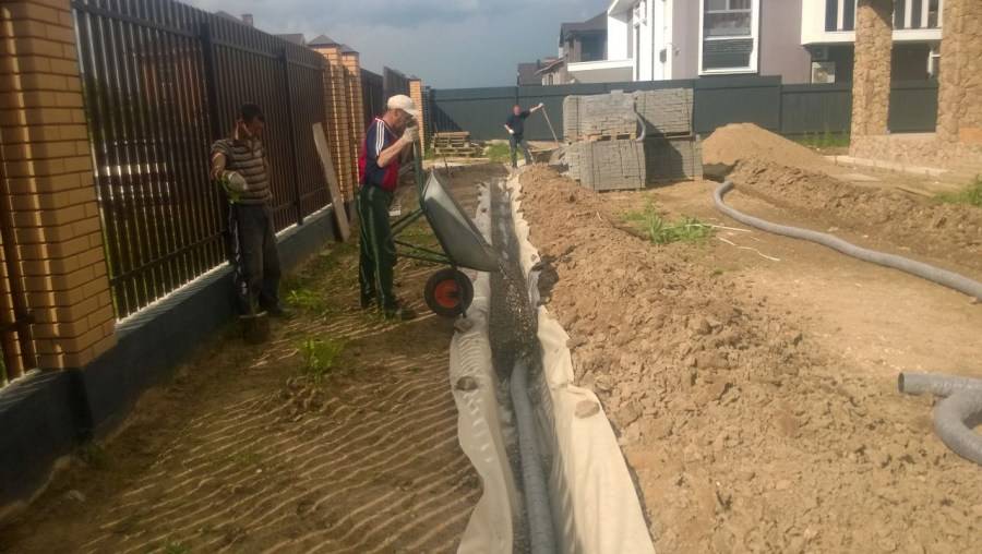 Дно траншеи следует засыпать слоем щепы в 100 мм, а затем мелким гравием, щебнем или изъятым ранее грунтом. Канавку можно и забетонировать, но данный способ более трудоемок и затратен. Установка сливных труб и ливневки повысит качество все дренажной системы.