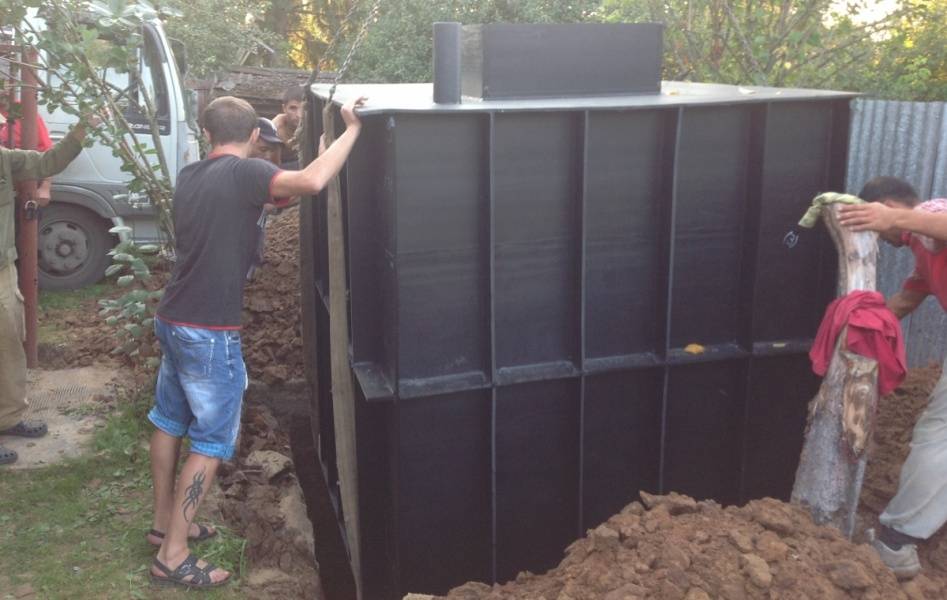 - В резервуаре проделываем отверстие, размер которого равен диаметру обсадной колонны. Установку опускаем в котлован в центральной части колонны.