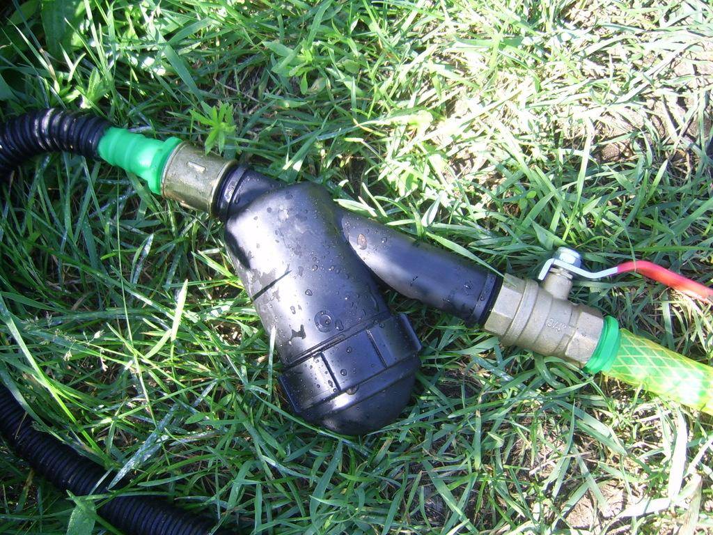 - Сбор узла фильтрации. Он состоит из 2 фильтров, а именно: фильтра-грязевика и фильтра для тонкой очистки. Между собой фильтры соединяются муфтой, на них накручиваются соединители, после чего весь узел присоединяется к основному шлангу.