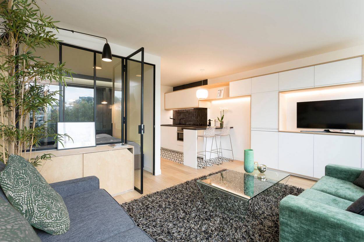 Открытая планировка хороша не только в больших загородных домах, но и в обычных квартирах. Совмещая жилую комнату площадью в 20 квадратных метров и кухню площадью в 7 квадратных метров, вы получаете роскошное пространство площадью 27 квадратных метров, с двумя окнами, балконом, но теперь с одной дверью, что кстати тоже экономит место!
