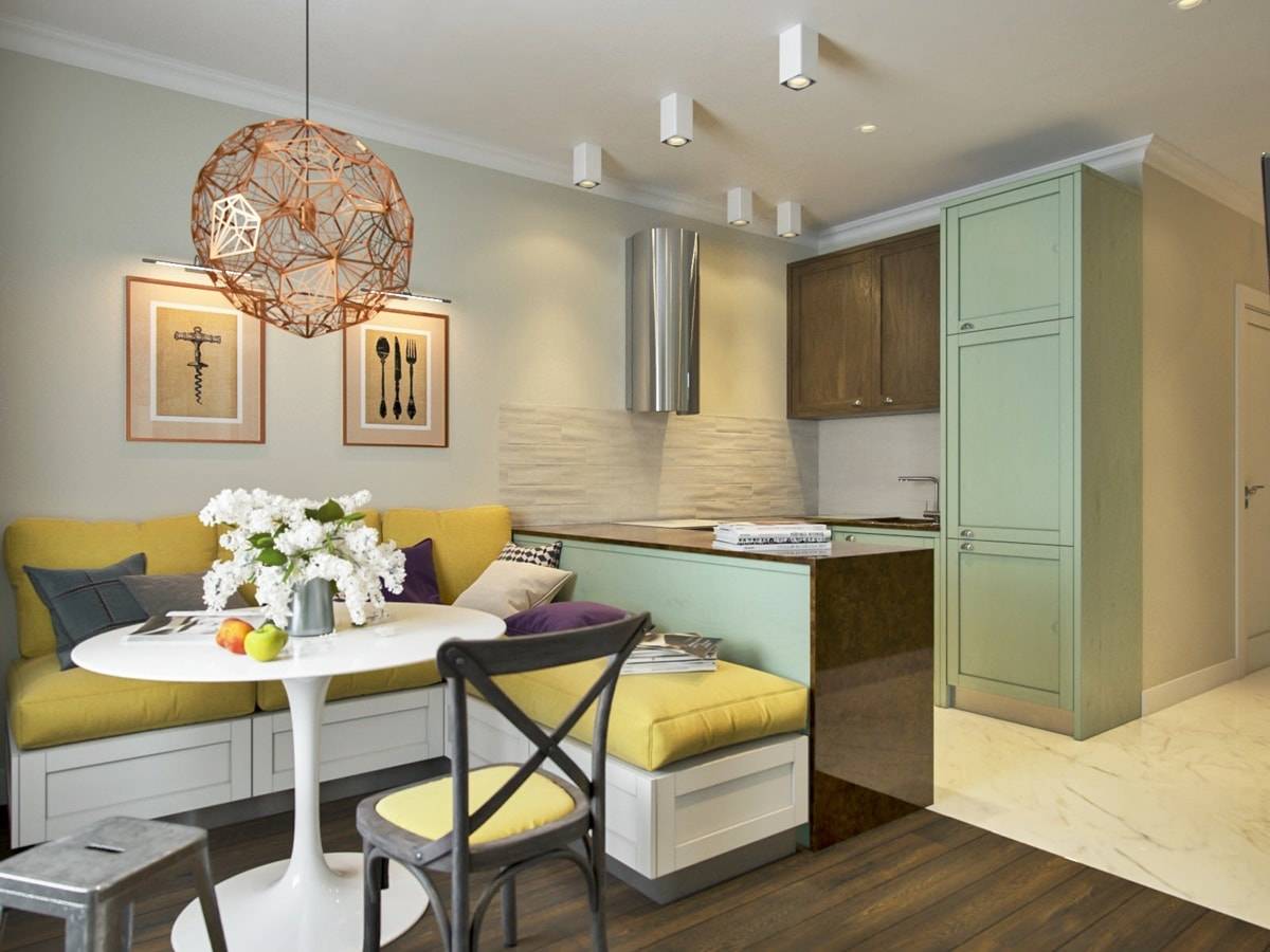 Рабочее пространство полностью оборудуют гарнитуром, техникой, сантехникой. В обеденной зоне устанавливают небольшой столик и стулья. Для отдыха используют мягкий уголок или диван с креслом.