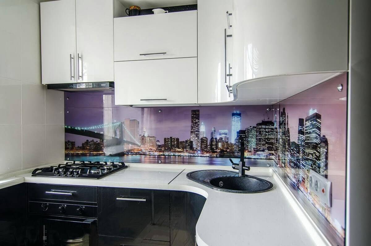Несмотря на то, что стеклянный кухонный фартук является универсальным решением для дизайна кухни, для маленького помещения он даже более предпочтителен, так как визуально делает пространство более просторным и светлым. Такой кухонный фартук может содержать пейзажи (природные и городские), фотопринты из личной семейной фотоколлекции, орнаменты и дизайнерские рисунки.