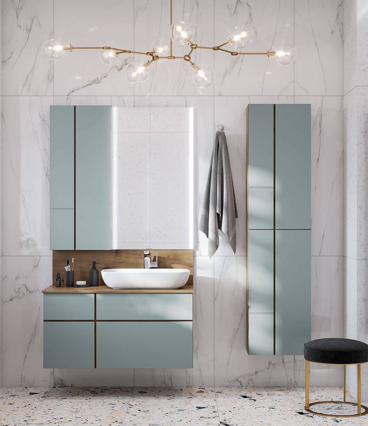 Фасады мебели в тон белой угловой ванне и отделке стенИсточник static.azbukasantehniki.ru