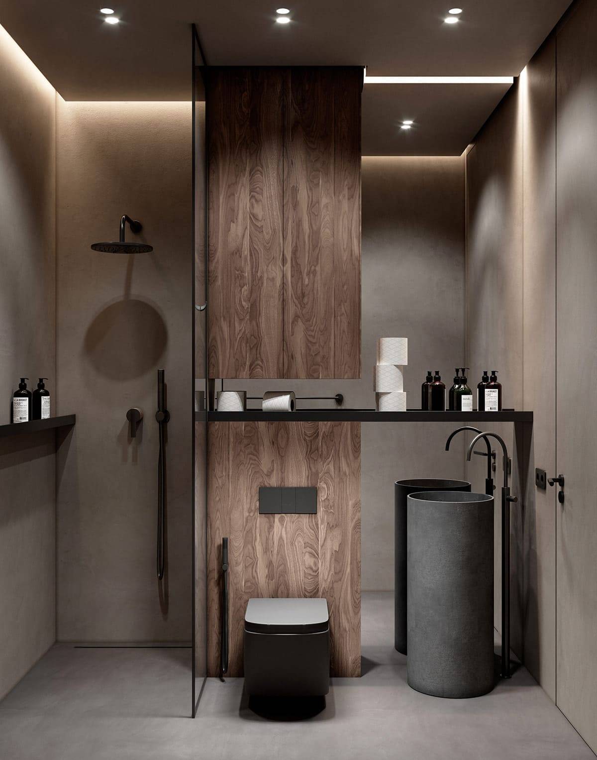 Современный интерьер ванной предполагает использование натуральных материалов, а именной обилие бетонных, каменных и деревянных элементов в дизайне помещения.