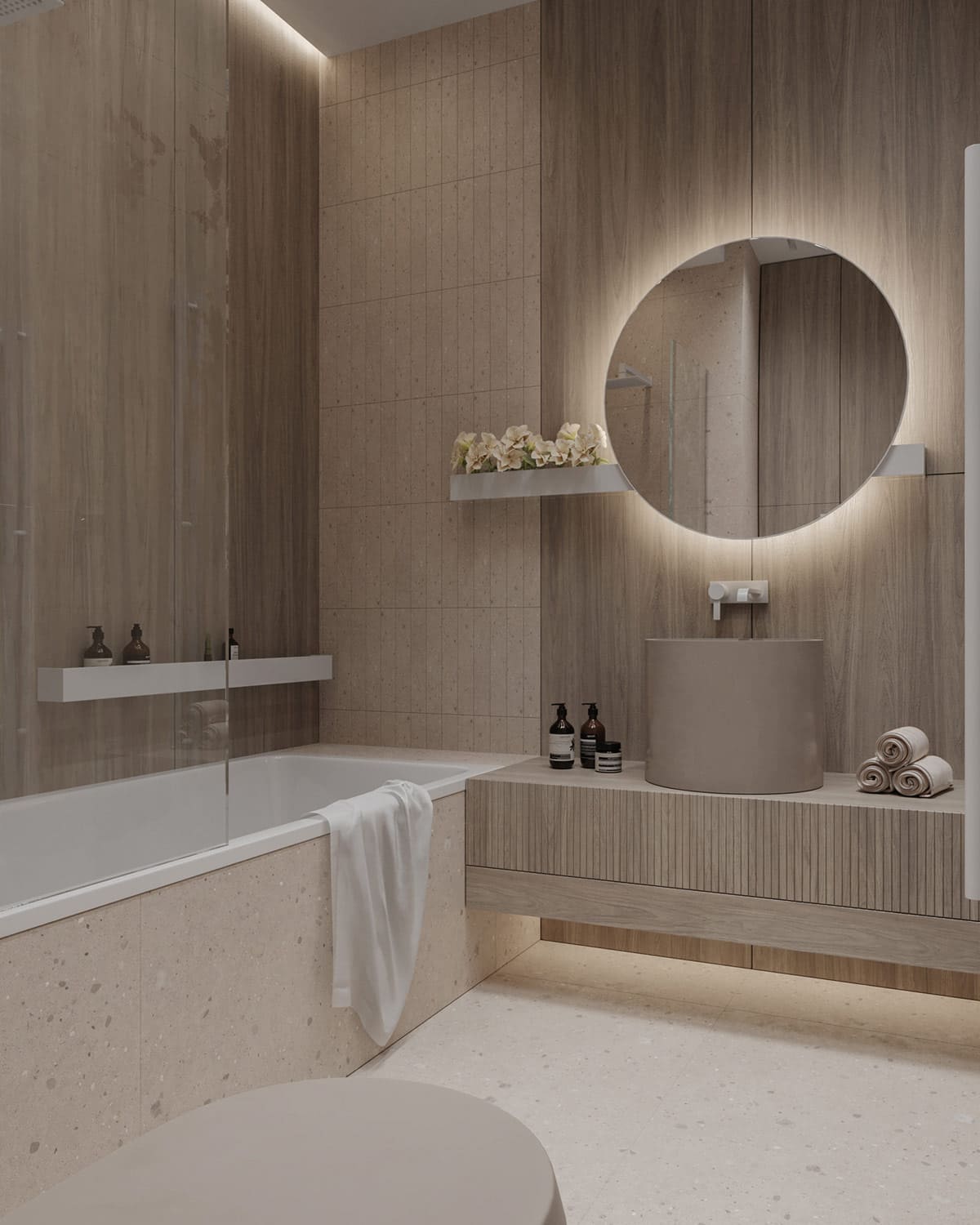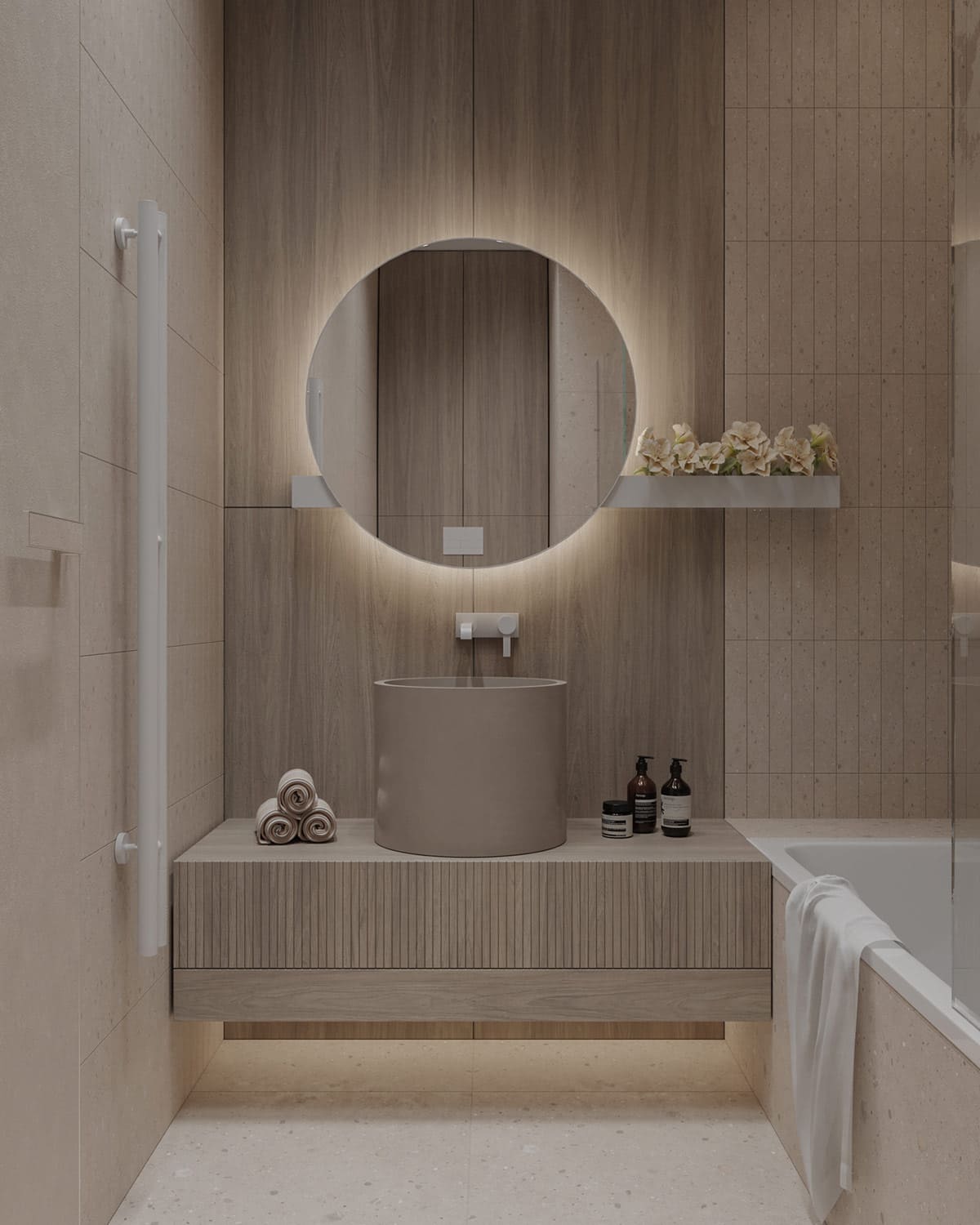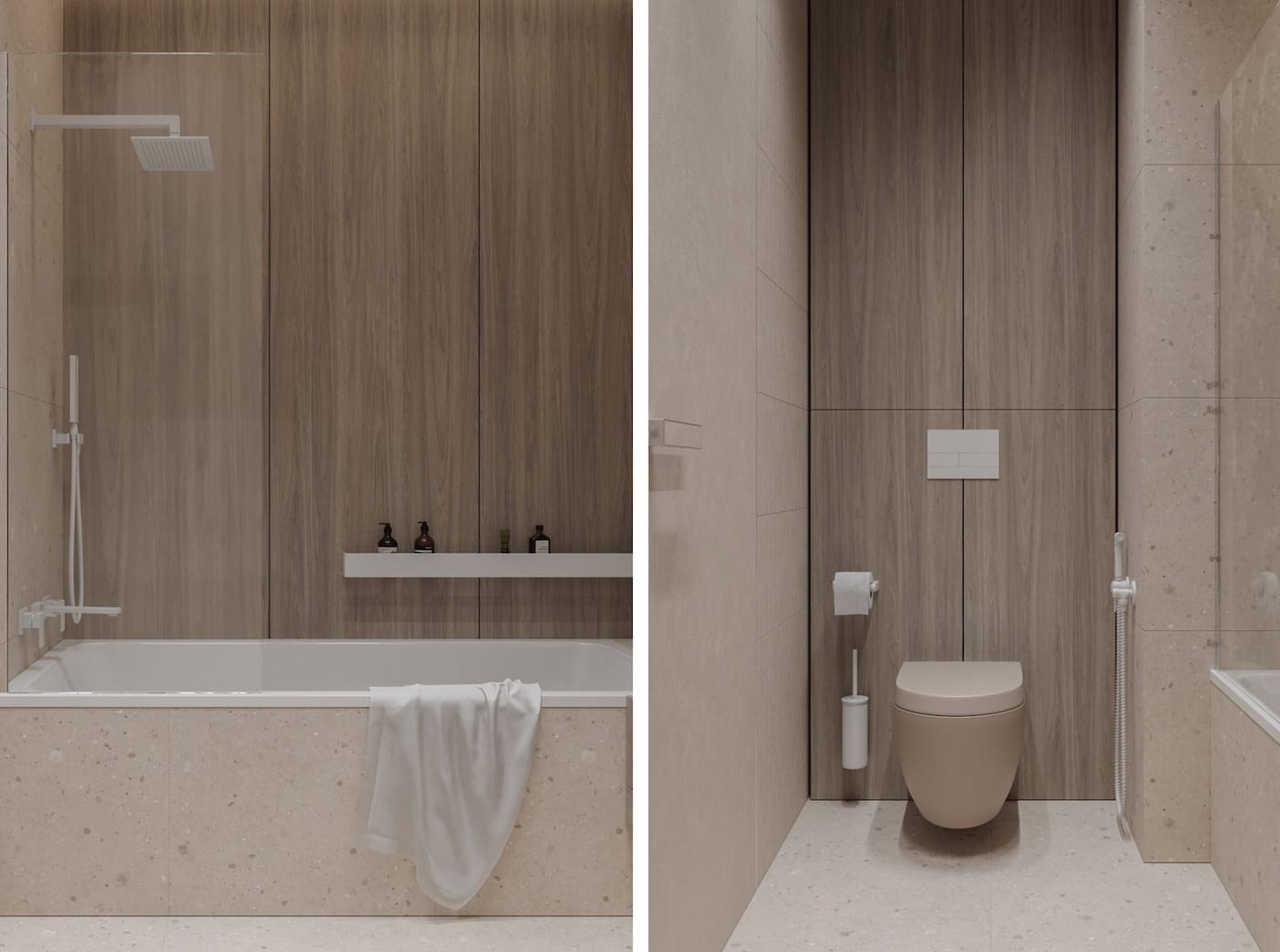 Вариант № 2. Монотонность и нейтральные цвета. Дизайн ванной и санузла с использованием одного цвета (бежевый, белый, коричневый) – нейтральный с точки зрения моды.