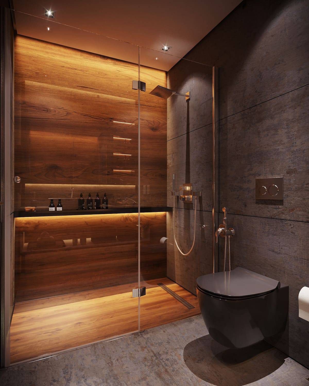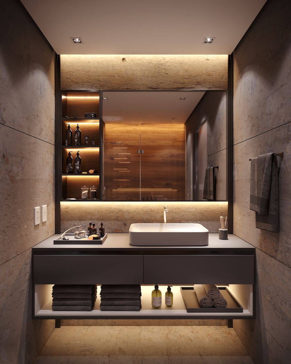 Также стоит осветить полки в ванной светодиодными лентами. Благодаря им у вас есть возможность в кратчайшие сроки найти самое необходимое. Такие минималистичные световые акценты создают приятную атмосферу в небольшом пространстве ванной комнаты и положительно влияют на ваше самочувствие.