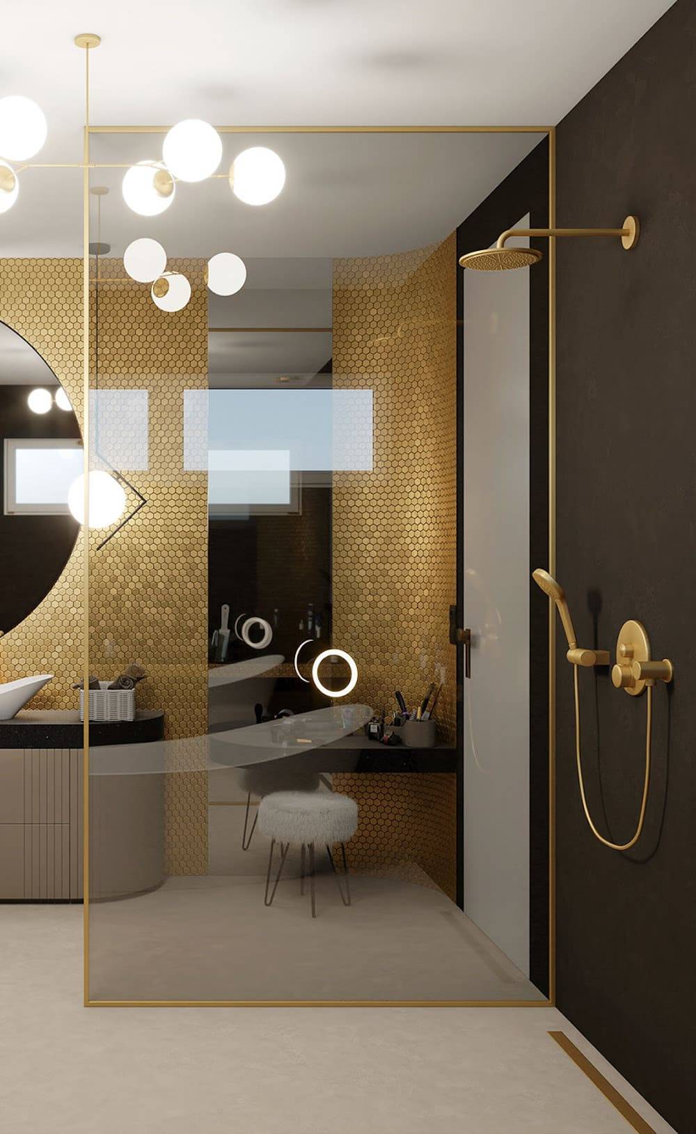 Большие зеркала и активное использование стеклянных деталей интерьера.