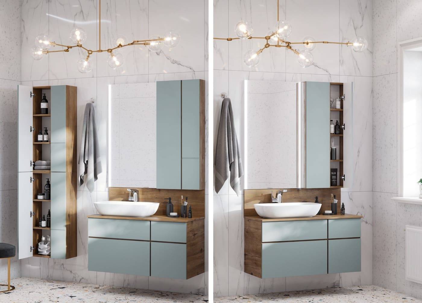 Если ванная комната и туалет отдельные, функциональная планировка предполагает использование только самой ванны/душевой и раковины. Под последней обязательно разместите тумбу (желательно подвесную, чтобы освободить пол), над умывальником — зеркало (также можно совместить с местом для хранения, выбрав шкаф с зеркальными дверцами).