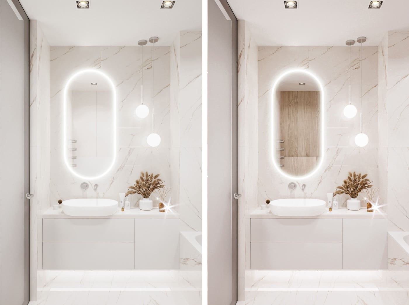 Настенные светильники, располагаемые по обе стороны и над зеркалом, — еще одно необходимое освещение для компактной ванной комнаты. Благодаря световому лучу с индексом цветопередачи более 80 у вас есть возможность создать идеальный макияж или выполнить другие гигиенические действия.